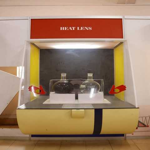 On putting both our hand on the red hand mark and wait for a while we will notice that the left palm feels hotter than the right palm although no light is received on the left palm. The lamps are both of the same wattage and both emits visible light rays as well as invisible heat rays. The glass flask on the right contains water, which allows light to pass through it, but blocks heat rays. Behaving as a spherical lens, it focuses light rays on our palm. The other flask contains a chemical compound, which allows heat rays to pass through while blocking light rays. The spherical shape of its container converges the heat rays on to our palm, and hence we fell hot.